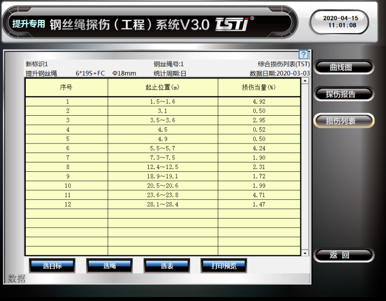 在系統軟件中可查看實時探傷曲線,探傷數據報表實時了解鋼絲繩損傷狀況,記錄鋼絲繩隨時間變化的損傷狀態(趨勢)。系統增加智能化AI統計算法,有效的剔除異常雜點,使探傷數據準確可靠,重復性好。同時增加無標定算法,可有效解決設備溫度引起的漂移和檢測方向干擾問題。